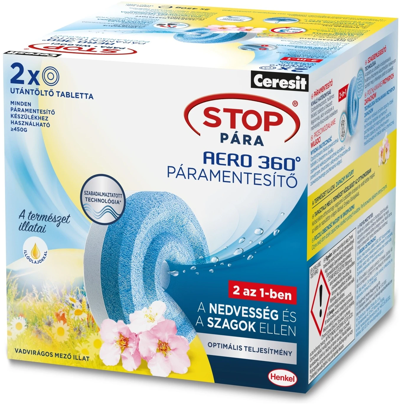 Ceresit AERO 360° tabletten – de unieke, dubbelwerkende tablet is gecombineerd met een lichte geur van wilde bloemen. Bestrijdt overmatige vochtigheid, luchtvochtigheid en onaangename geurtjes, terwijl de geur bijdraagt aan een kalme, geurige sfeer.