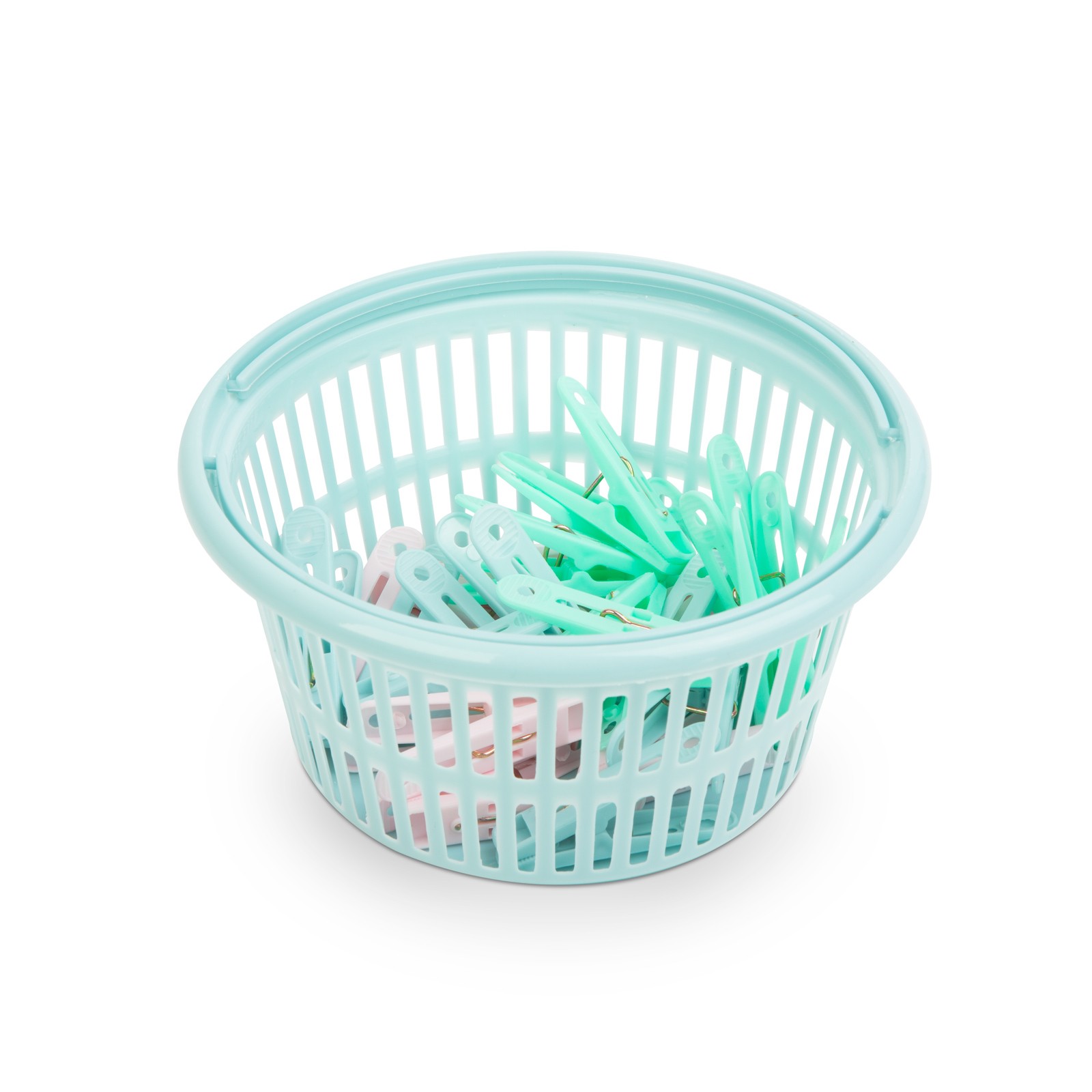 Kleurrijke kunststof speldenset met een praktisch opbergmandje met handgrepen.