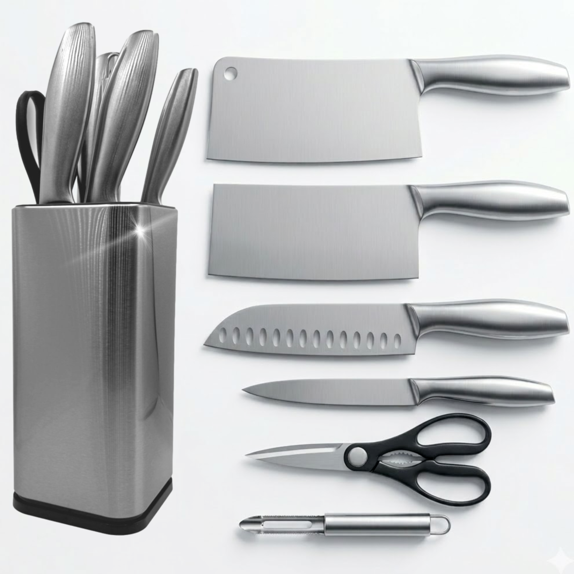 Als je dol bent op koken, is deze prachtige messenset hét missende onderdeel in jouw keuken! Het messenblok en de messen zijn vervaardigd uit hoogwaardig RVS en zijn hierdoor vlijmscherp! Het blok bevat de meest essentiële keukenbenodigdheden.