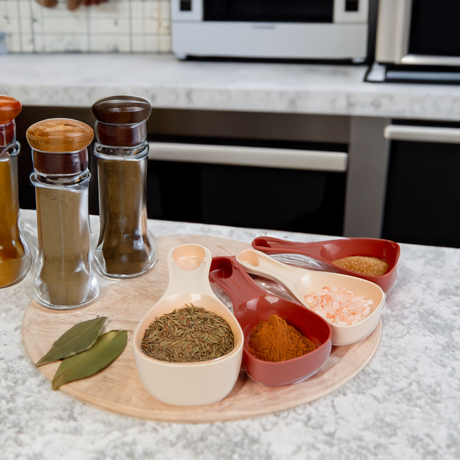 De hoeveelheden ingrediënten die in de recepten worden beschreven, kunnen alleen worden gemeten met exacte hoeveelheden. Deze maatlepelset helpt ons bij het afmeten van vloeibare ingrediënten.