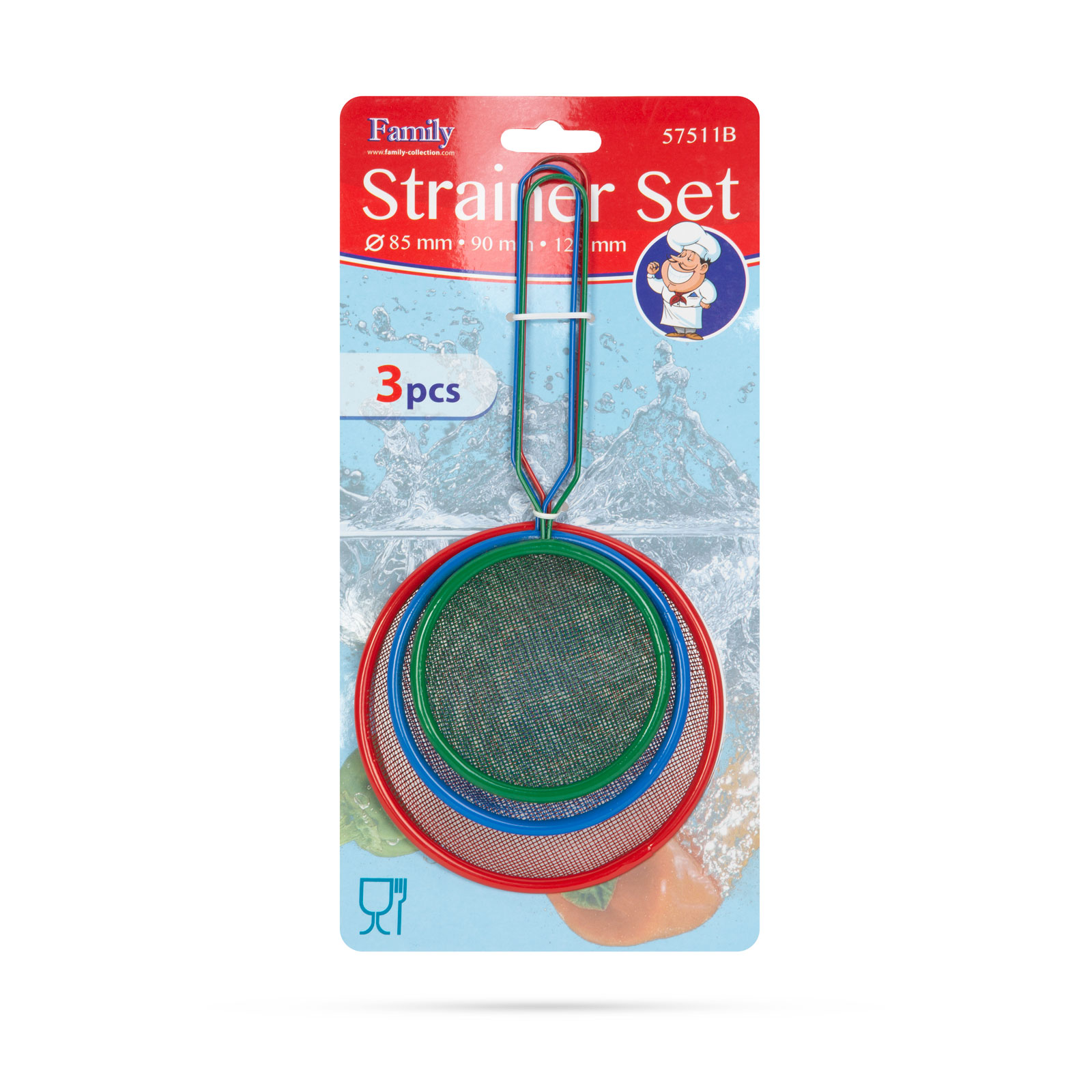 Op zoek naar de perfecte keukenzeef? Wij hebben dé oplossing voor jou! De Zeef Set van 3 maten is een must-have voor elke keukenprins(es). Of je nu een bolzeef of een gewone zeef nodig hebt, deze set heeft het allemaal. En met 3 verschillende maten (12CM, 9CM en 8.5CM) in vrolijke kleuren (blauw, rood en groen), kun je elke klus aan! Vergeet die onhandige en inefficiënte zeven, kies voor onze kwalitatieve en stijlvolle Zeef Set van Family Pound.