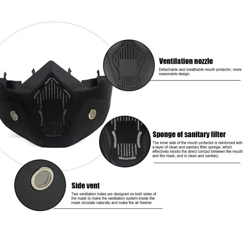 Dit masker belemmert het ademhalen niet door speciale luchtgaten in de zijkant van het masker. Hier zijn filters in bevestigd die vuil en zand buiten houden!