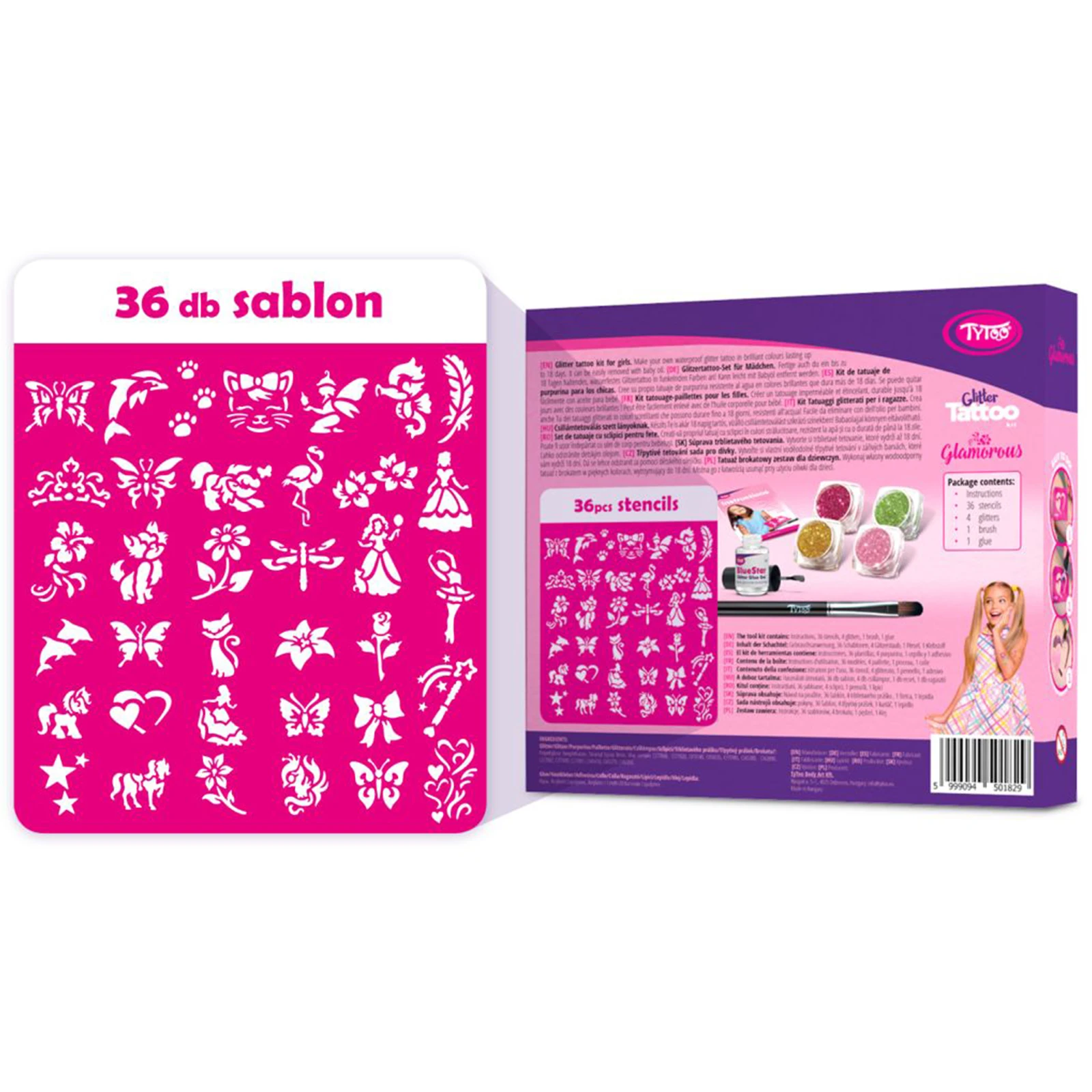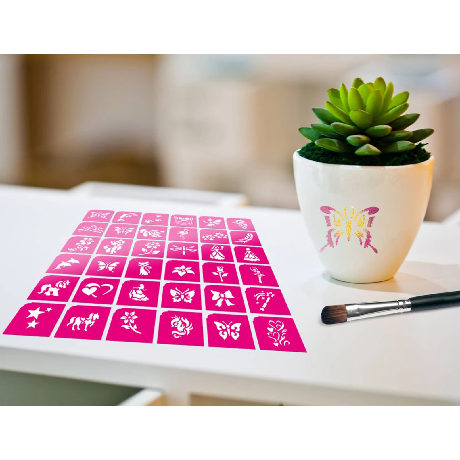 Een favoriete set met miniprinsessen, vol vlinders, bloemen en andere meisjesachtige sjablonen. Je kunt gemakkelijk 35 schitterende glittertattoos voor kleine meisjes maken die wekenlang blijven zitten. In de set vind je alles wat je nodig hebt om tatoeages te maken. Speciaal ontworpen voor meisjes van 3-12 jaar, met vlinder, prinses, sterren, strik en nog veel meer ontwerpen.