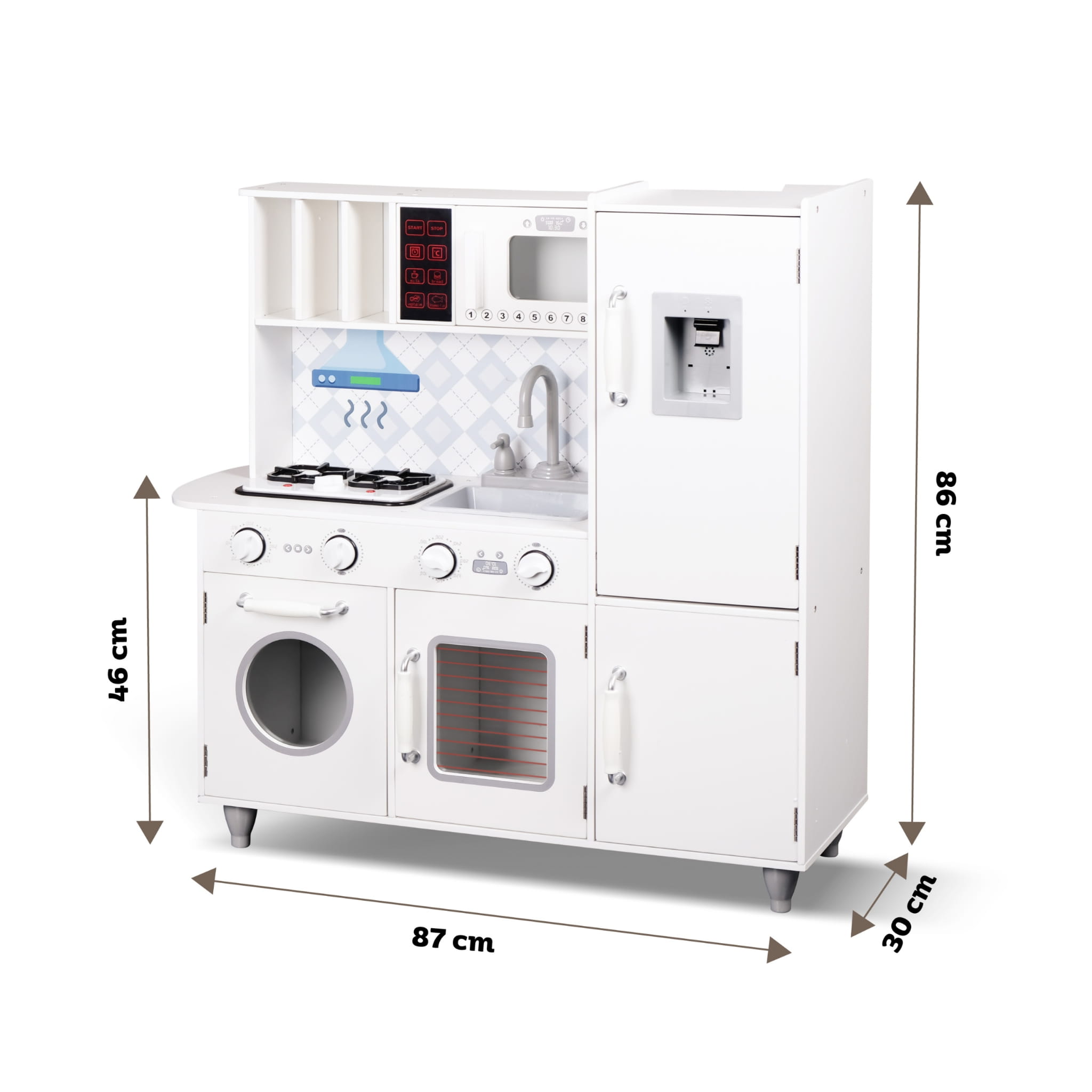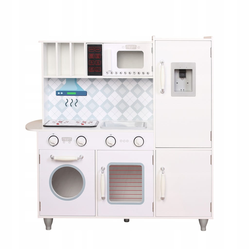 Een houten keukentje ziet er veel beter uit dan een plastic keukentje. Het wordt een volwaardig meubelstuk in de kinderkamer. De oven, magnetron en wasmachine die open kunnen, kunnen als kasten worden gebruikt – ze zijn perfect voor het opbergen van producten of keukenapparatuur.