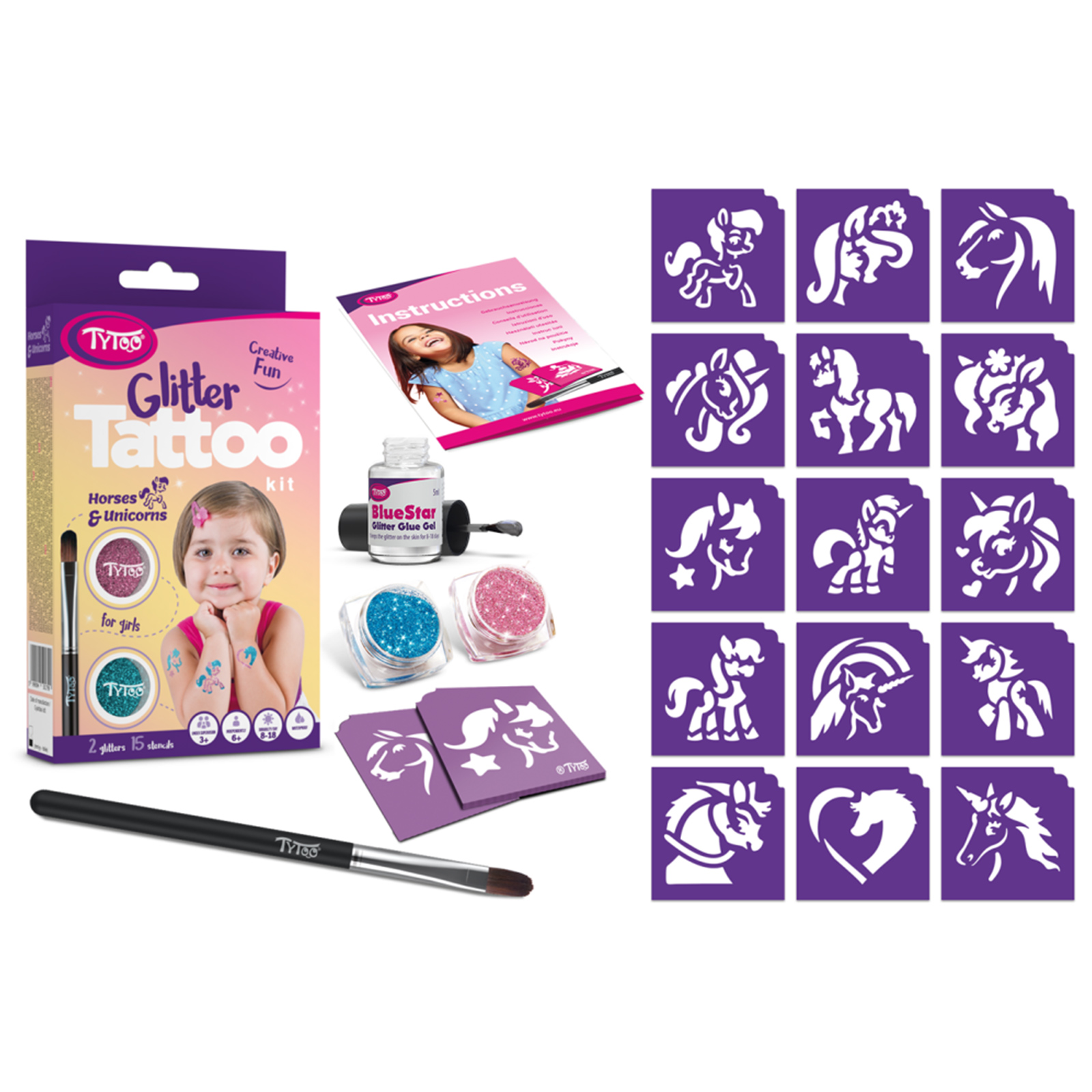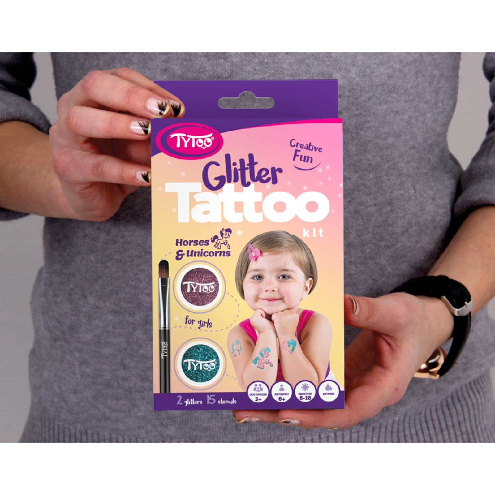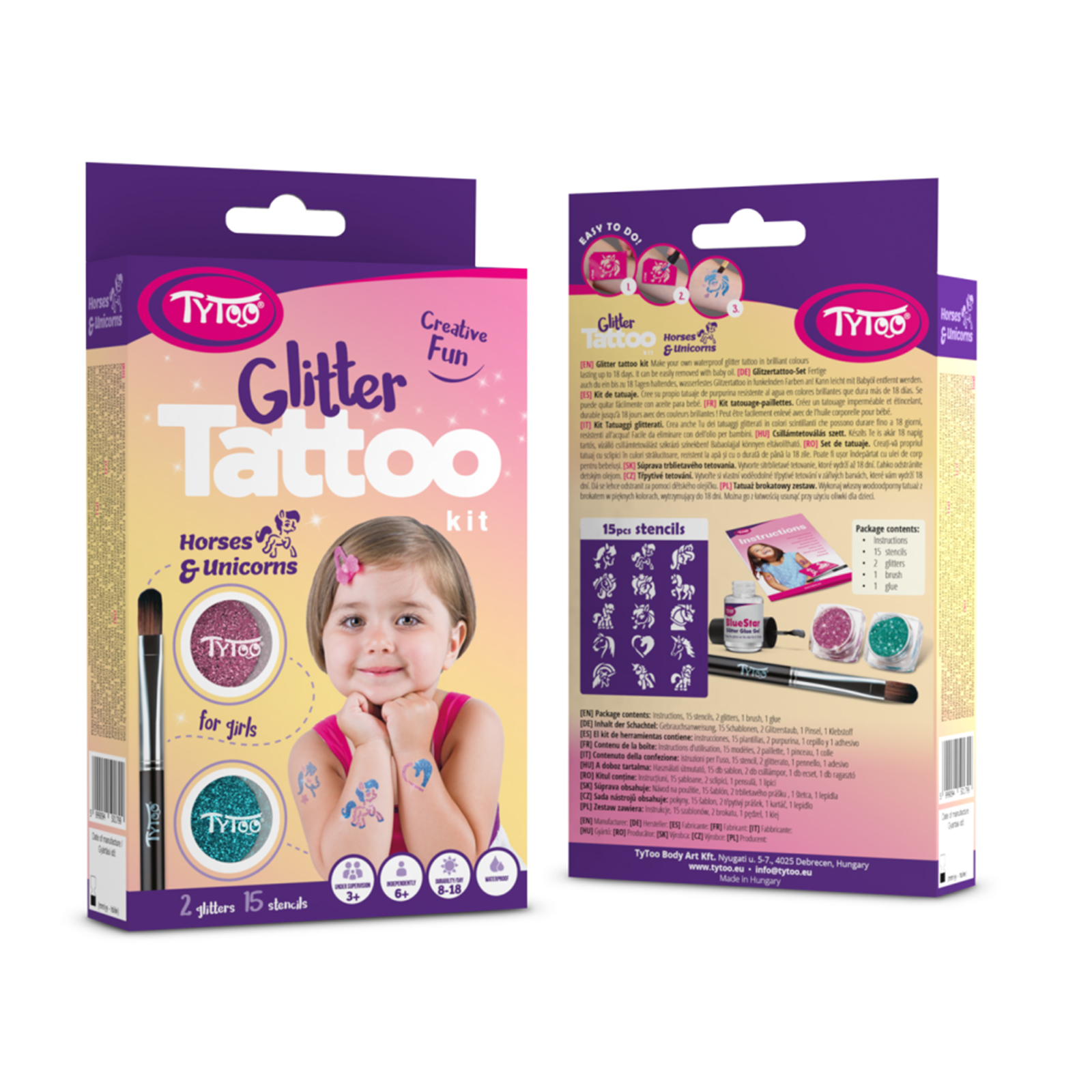 TyToo glittertattoos kunnen ook veilig door kinderen worden gebruikt, omdat het cosmetische kwaliteitsmaterialen bevat die voldoen aan de EU-regelgeving. Het aanbrengen is eenvoudig, zelfs een kind van 6 kan zijn eigen glittertattoo maken. Bovendien kunnen ze zelfs hun vaardigheden verbeteren tijdens het maken. De set zit vol met sjablonen voor paarden, pony’s en eenhoorns, die speciaal ontworpen zijn voor de kleine armpjes van je kind. Je kunt dus gemakkelijk je eigen kleine glittertattoo’s maken, maar samen plezier hebben is nog leuker voor ze!