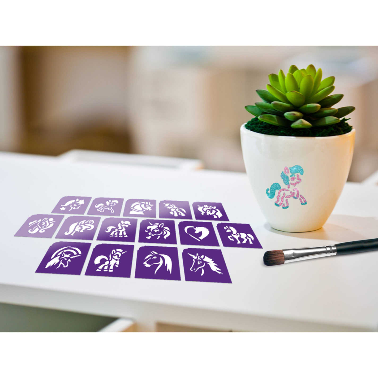 Je kunt gemakkelijk 15 glanzende glittertattoos voor kleine meisjes maken die weken blijven zitten. In de set vind je alles wat je nodig hebt om tatoeages te maken. Speciaal ontworpen voor meisjes van 3-12 jaar, met paarden-, pony- en eenhoornmotieven.