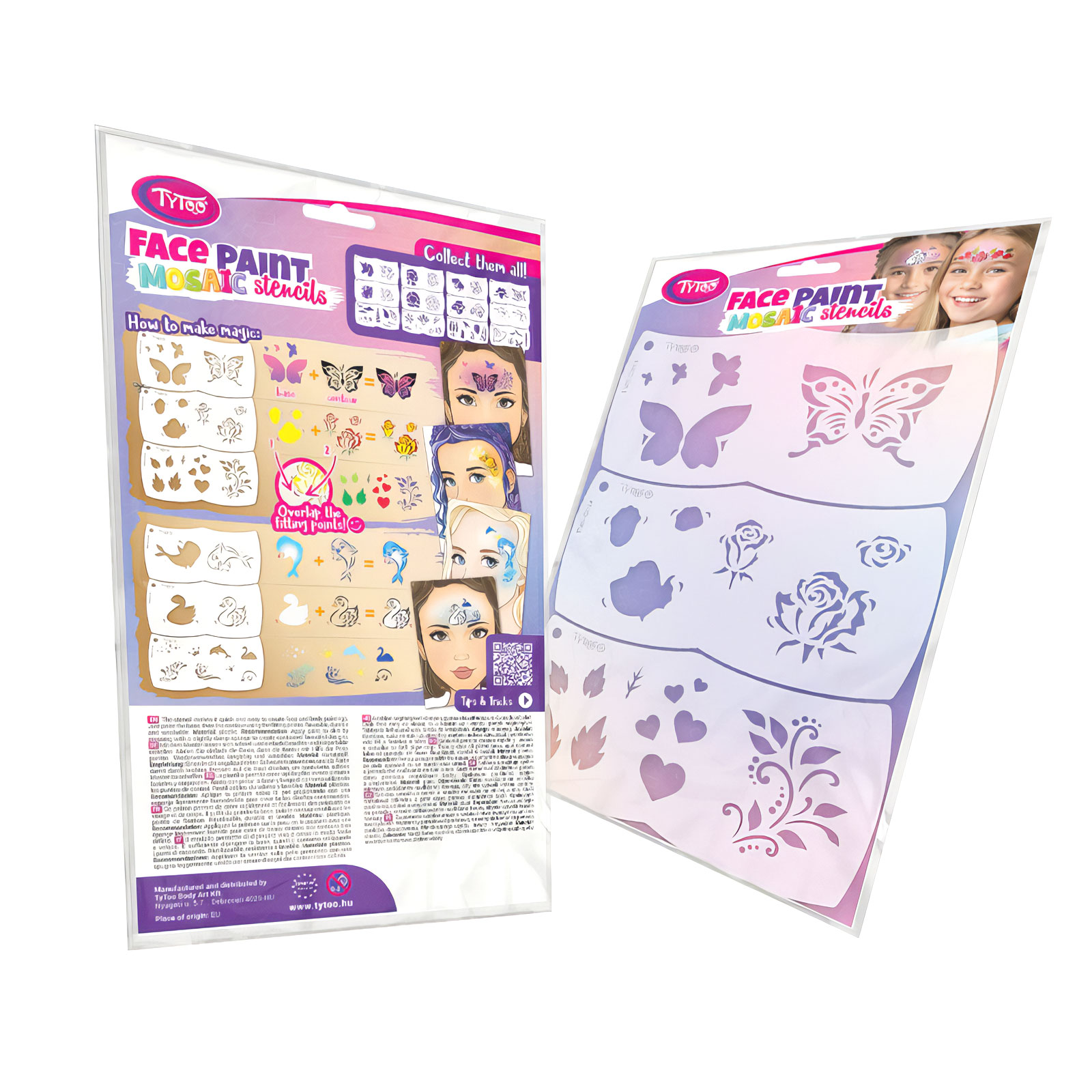 Schminken is erg leuk voor kinderen en je kunt het thuis doen met de TyToo Mozaïeksjablonen zonder enige tekenvaardigheid. Met de TyToo mozaïeksjabloon kun je gemakkelijk het ontwerp van je keuze schilderen. De vorm van het sjabloon is ontworpen om perfect op het gezicht van een kind te passen en is gemakkelijk te hanteren, waardoor het zeer comfortabel in gebruik is. De bijpassende punten, die deel uitmaken van de patronen, maken het gemakkelijk om de patronen precies op elkaar te plaatsen, ze weg te halen en tijdens het schilderen weer op dezelfde plek terug te zetten.