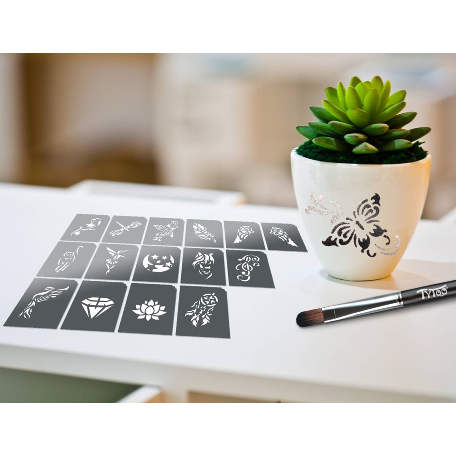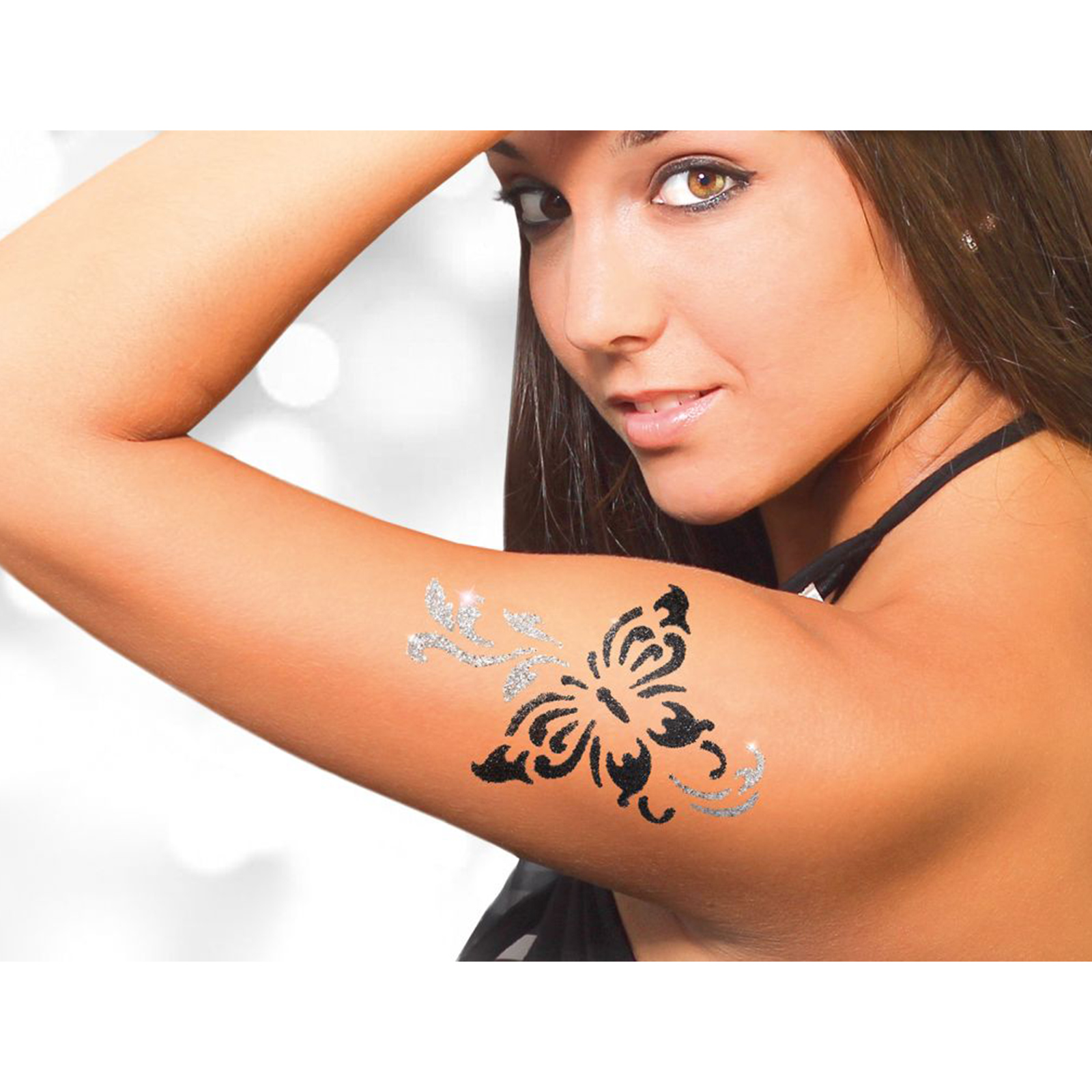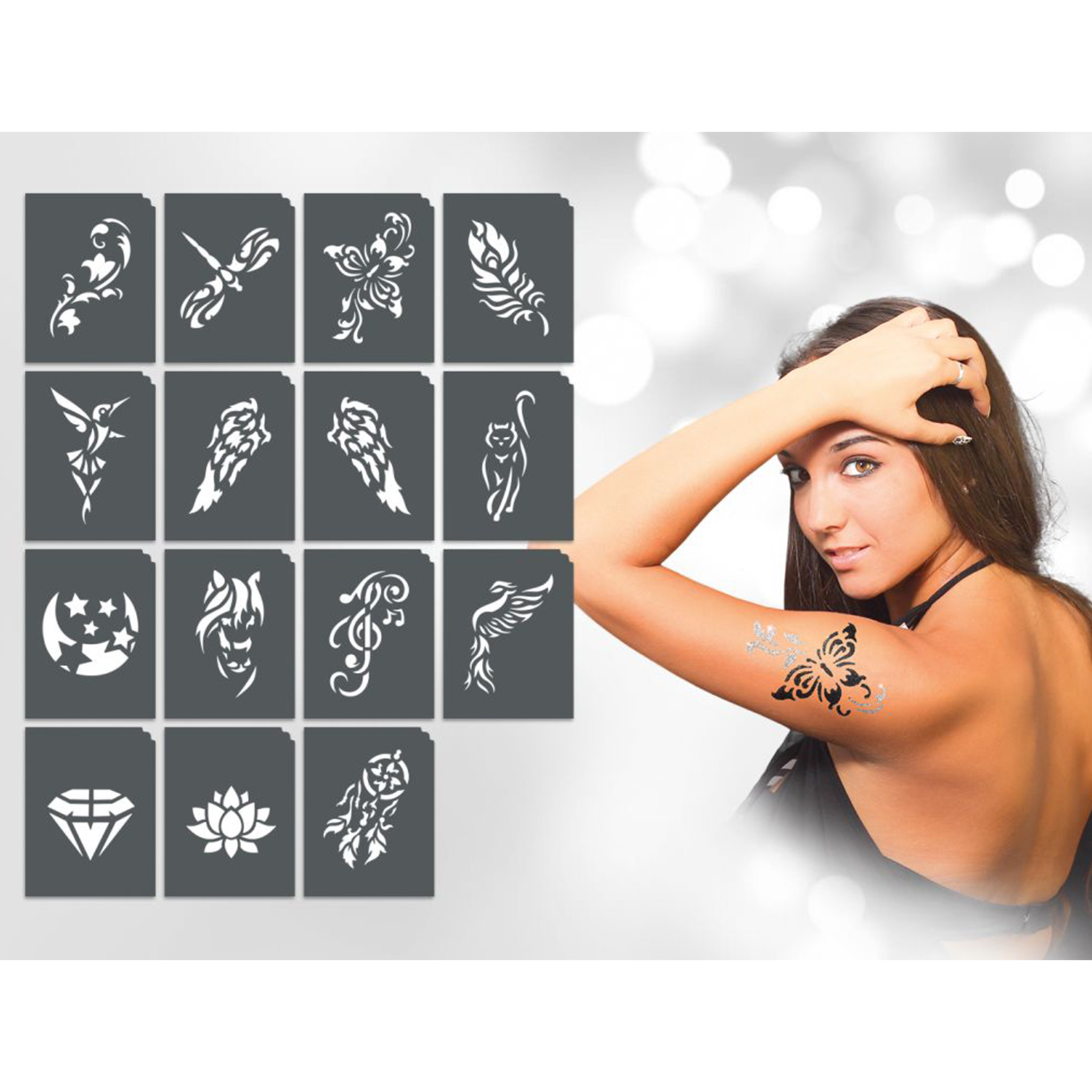 Met behulp van de sjablonen in het pakket kun je glittertatoeagepatronen voor vrouwen maken, die je ook kunt gebruiken voor andere lichaamsbeschilderingen.