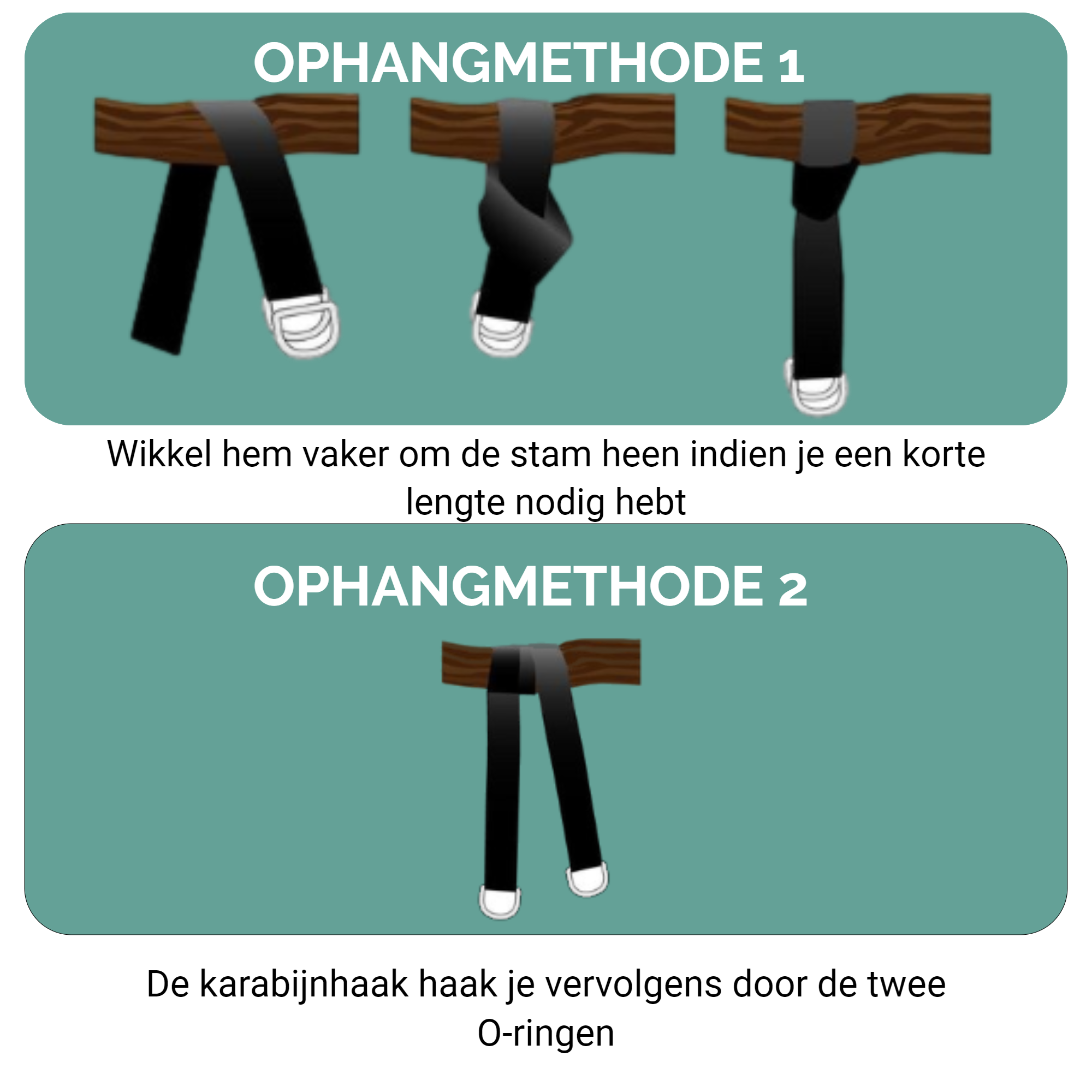 - Riemlengte: 280 cm (2 stuks) Aanbevolen word om de karabijnhaken te haken aan de O-ringen. De lengte van 1 riem is dan dubbelgeslagen circa 140cm