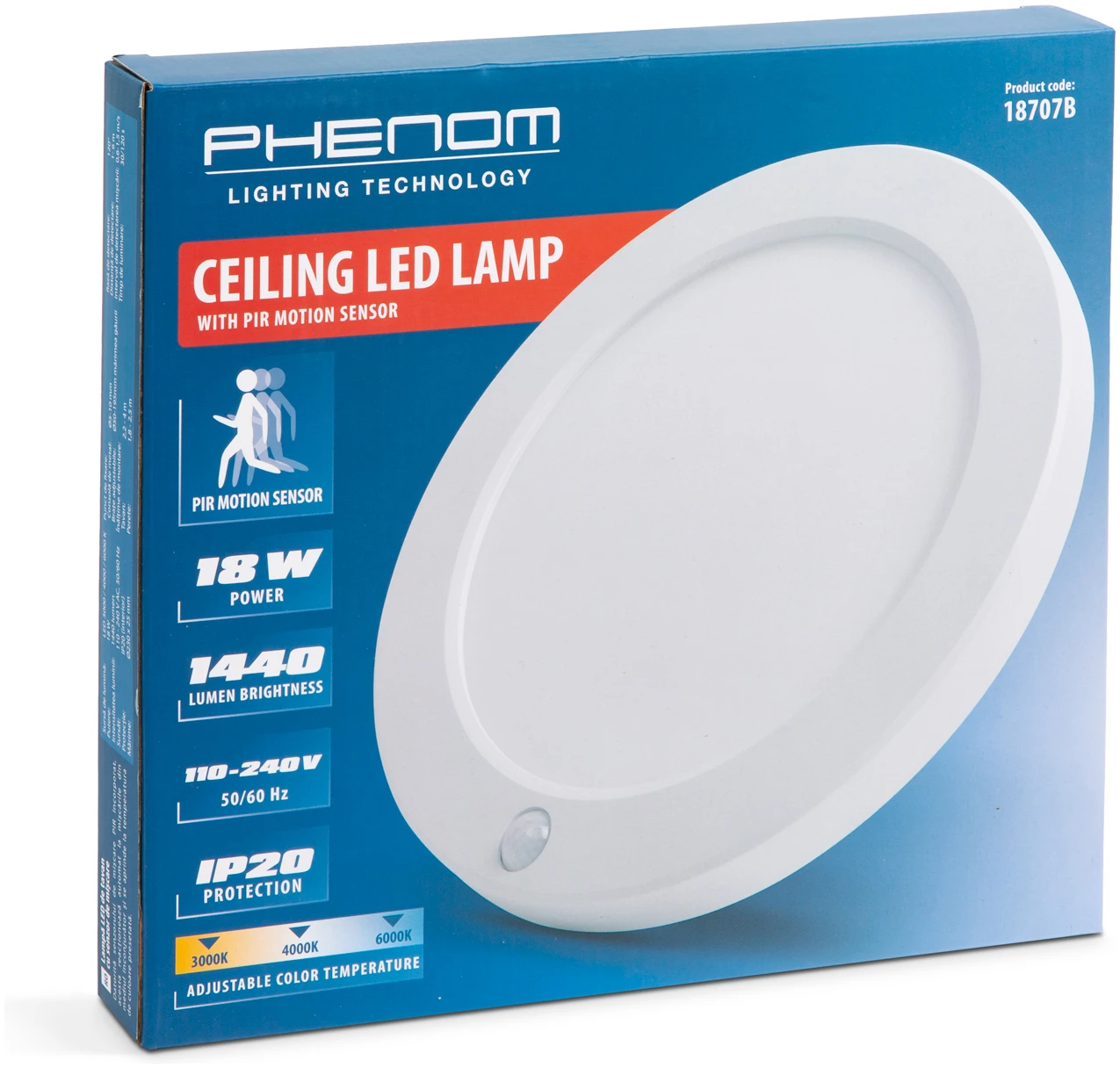 Lichtbron: LED LED-kleur: 3000 / 4000 / 6000 Kelvin Stroom: 18W Helderheid: 1440 lumen Detectiehoek: 120° Detectiebereik: 1 – 6 meter Waargenomen bewegingssnelheid: 0,6 – 1,5 m/s Verlichtingsduur: 30 / 120 seconden Energiebron: 110 – 240 V wisselstroom, 50/60 Hz Detectie van omgevingslicht: 10 – 2000 Lux Montage: Metalen beugel: Ø5-10 mm