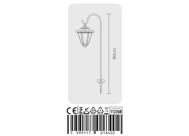 De standaard van metaal is circa 80 cm hoog en de lantaarn is vervaardigd uit ABS kunststof. Het is natuurlijk ook mogelijk om de lantaarn aan een andere haak of touwtje op te hangen! De LED geeft warm wit licht.