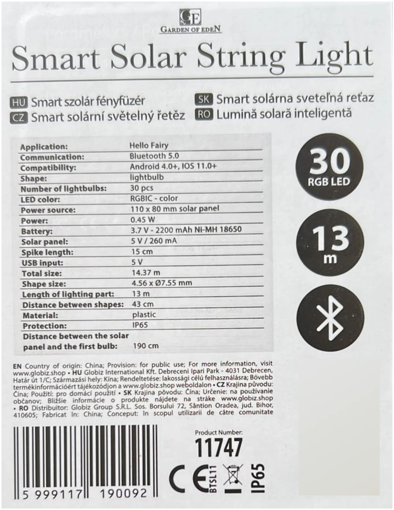 Met dit sfeervolle lichtsnoer van Garden of Eden tover je elke ruimte om! Dit lichtsnoer is uiterst geschikt voor buiten en binnen door zijn IP65 waterdichtheid. Het lichtsnoer is eenvoudig te monteren door de aanwezige haken op de fittingen. De lampen geven een verschillende kleuren licht en zijn hierdoor de ideale sfeermaker. De set bevat 30 lampen verdeeld over een lengte van 13 meter lang.