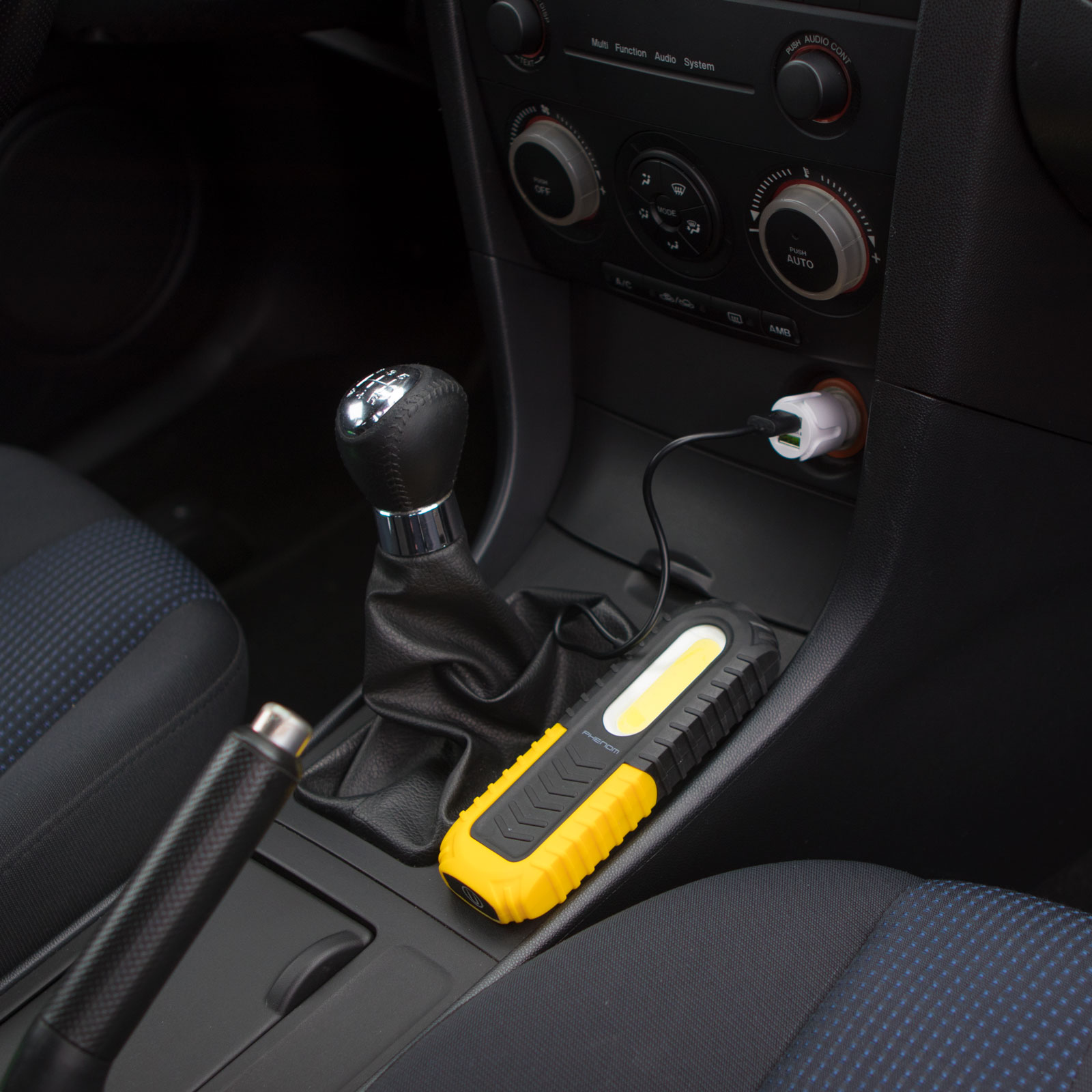 Kleine, maar krachtige werklamp. U kunt hem in geen enkele garage of werkplaats missen. De COB LED-technologie verlicht het gewenste werkgebied, dankzij de praktische 360°-ophanging, standaard en magnetische bevestiging is hij eenvoudig te plaatsen zoals u een lichtbron nodig hebt. U kunt hem overal mee naartoe nemen dankzij het lichte gewicht en de riemclip. De SoftTouch kunststof hoes zorgt voor een rondom antislip, stabiele grip. Twee-in-één lamp, aan de bovenkant met LED-zaklamp, aan de voorkant met COB LED-werklamp. De ingebouwde Li-ion accu maakt het een milieuvriendelijk apparaat met een lange batterijduur.