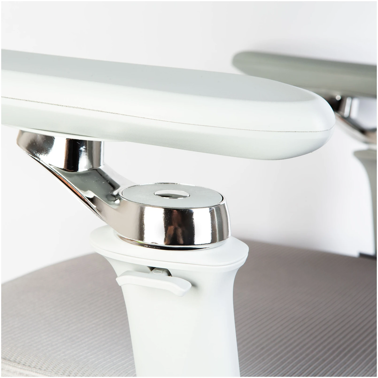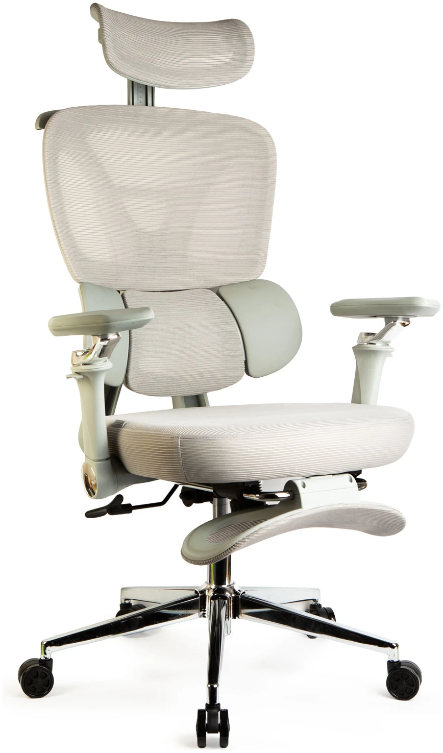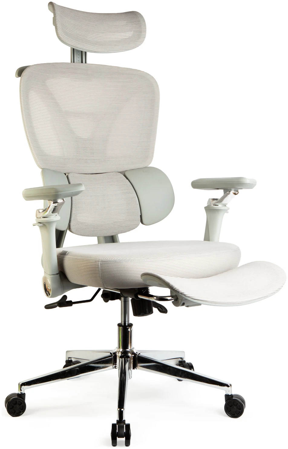 Moderne, comfortabele bureaustoel met hoofdsteun en voetensteun in grijs – een ideale keuze voor thuis of op het werk. Dankzij het ergonomische ontwerp en de verstelbare hoogte biedt hij comfortabel gebruik, zelfs tijdens langdurig zitten. De rugleuning en armleuningen zijn gemaakt van sterke maar flexibele materialen, terwijl de zitting is gemaakt van duurzaam multiplex. De armleuningen zijn verstelbaar in breedte, hoogte, diepte en kantelhoek, en kunnen worden neergeklapt wanneer ze niet worden gebruikt. De stoel is voorzien van een vergrendelbaar multimechanisme, gaslift en een metalen kruisvoet die stabiliteit en duurzaamheid garandeert.