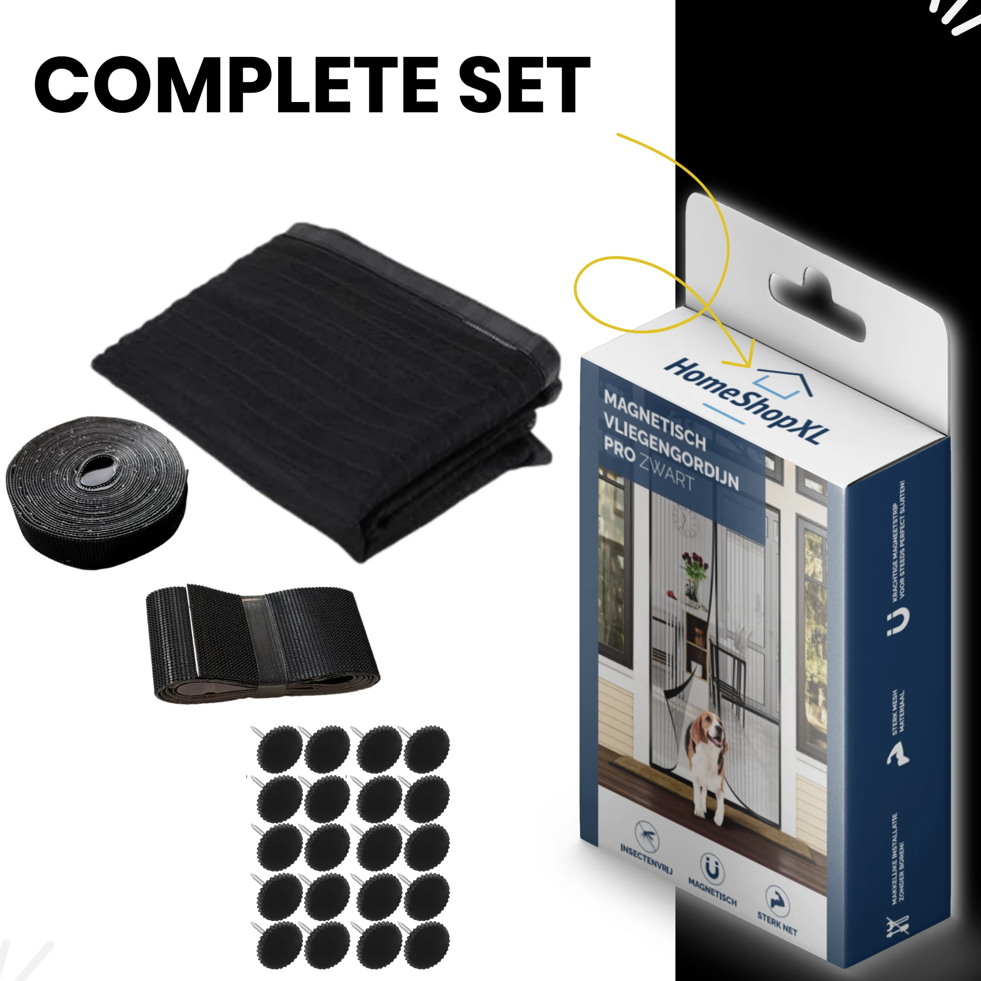 - Inhoud pakket: deurgordijn met ingenaaide gewichten en magneetsluiting, 4,6 meter klittenband voor verticale zijden, 1 meter klittenband voor bovenzijde, 20x premium punaise voor extra (optionele) versteviging in hout.