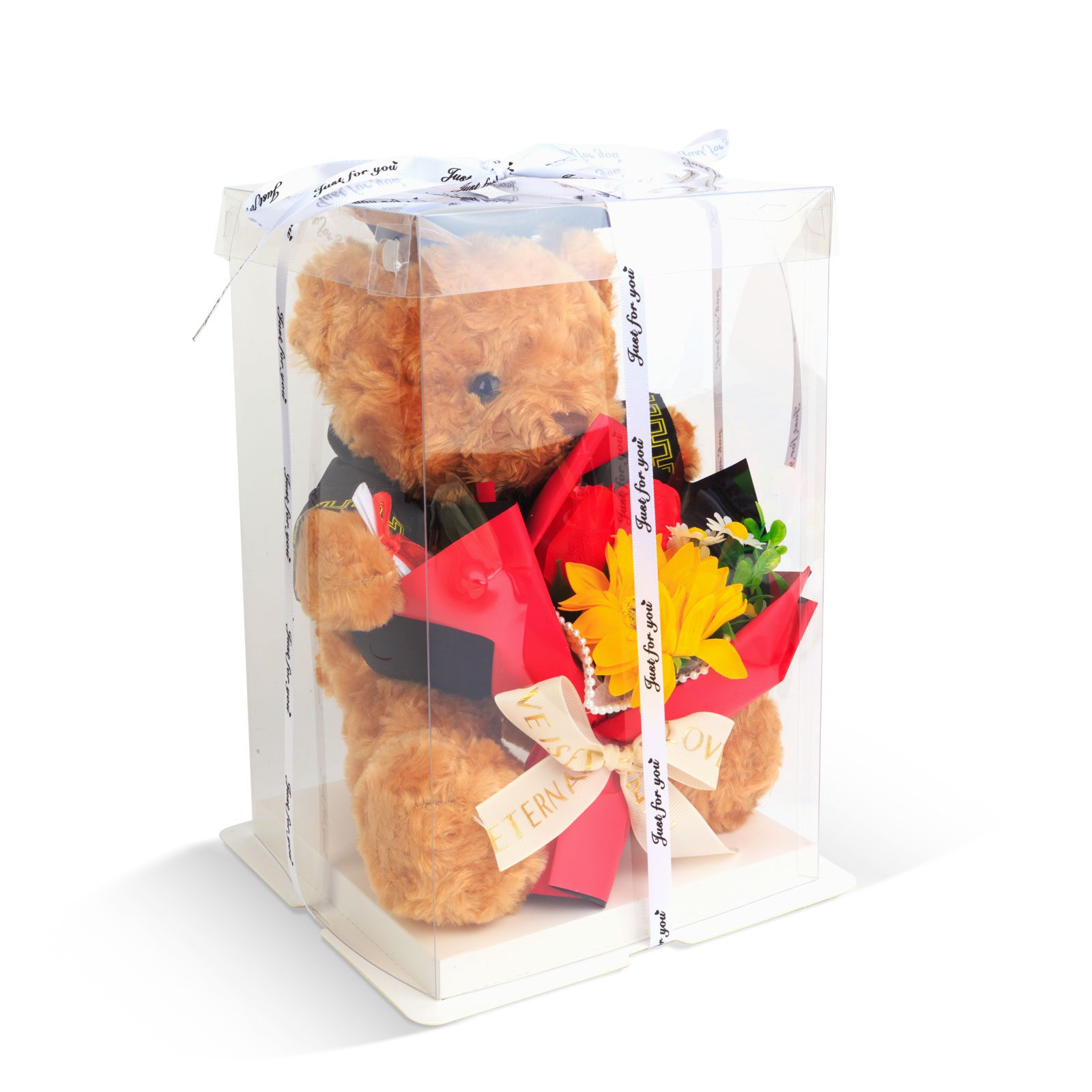 Verras je dierbaren met een bijzonder cadeau! Met deze teddybeer wordt elk feest onvergetelijk, of het nu gaat om een diploma-uitreiking, jubileum, verloving, Kerstmis, verjaardag of naamdag. De verpakking bevat een schattige teddybeer en één bloem. De bloem is verpakt in elegant papier. De compositie wordt geleverd in een plexiglas doosje dat de teddybeer beschermt tegen stof en vuil, zodat je er lang plezier van hebt. Dit charmante cadeau is ideaal voor een diploma-uitreiking, een diploma-uitreiking of andere felicitaties. Verrassing gegarandeerd!