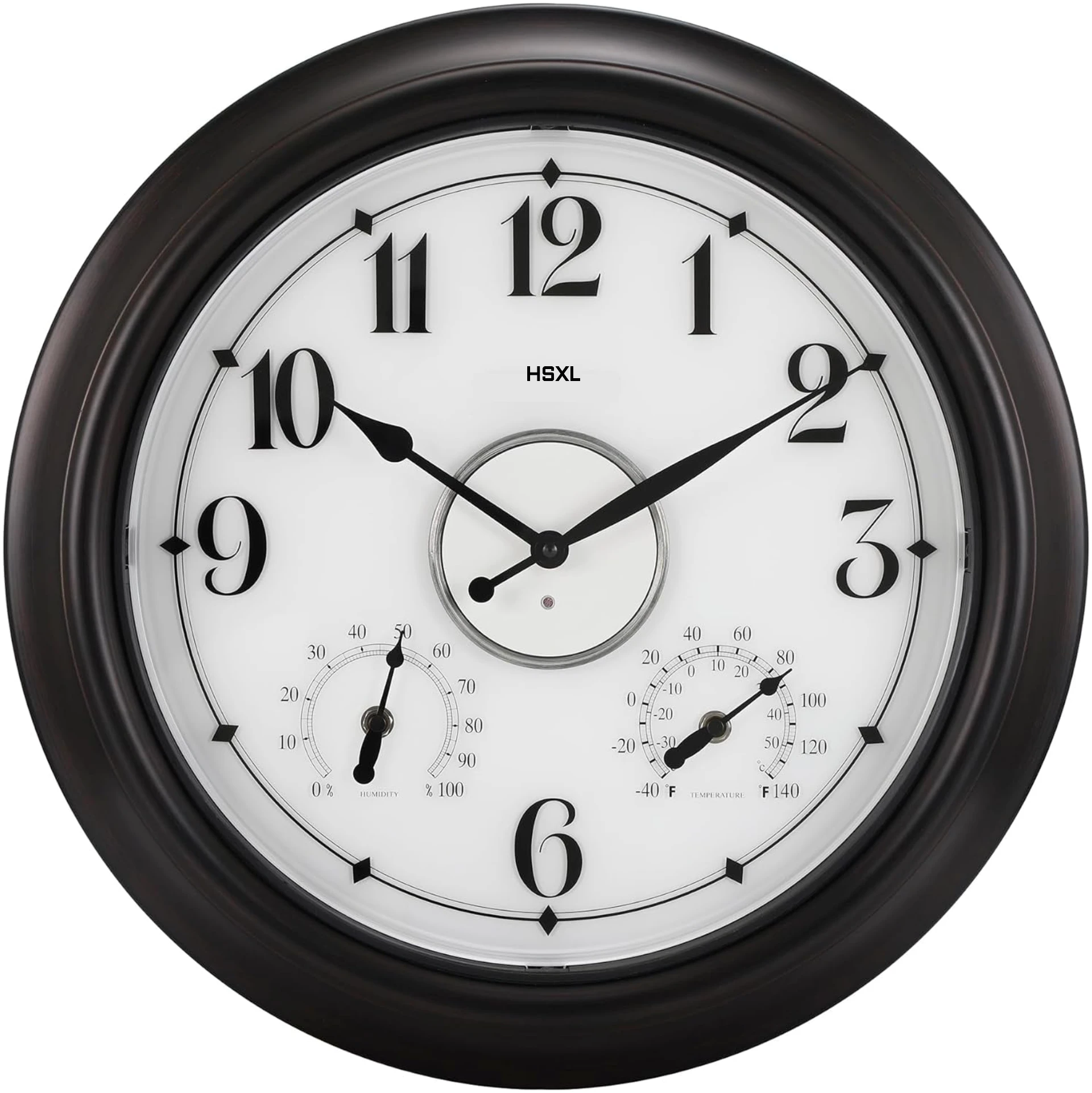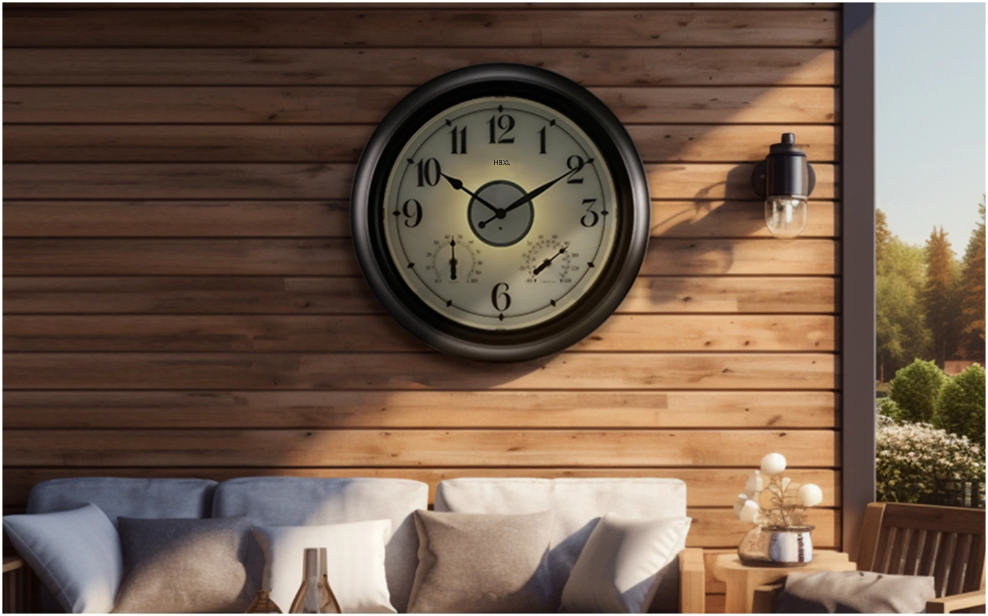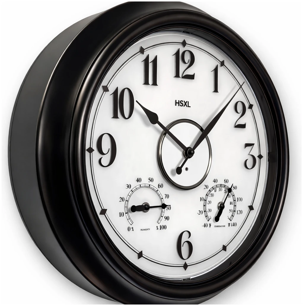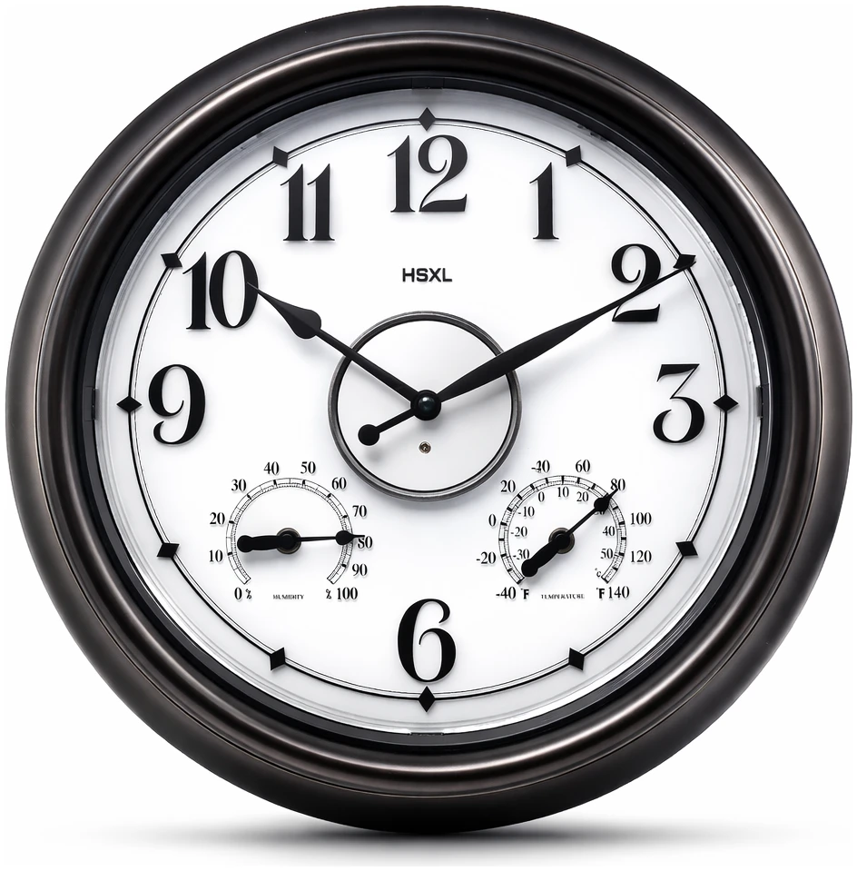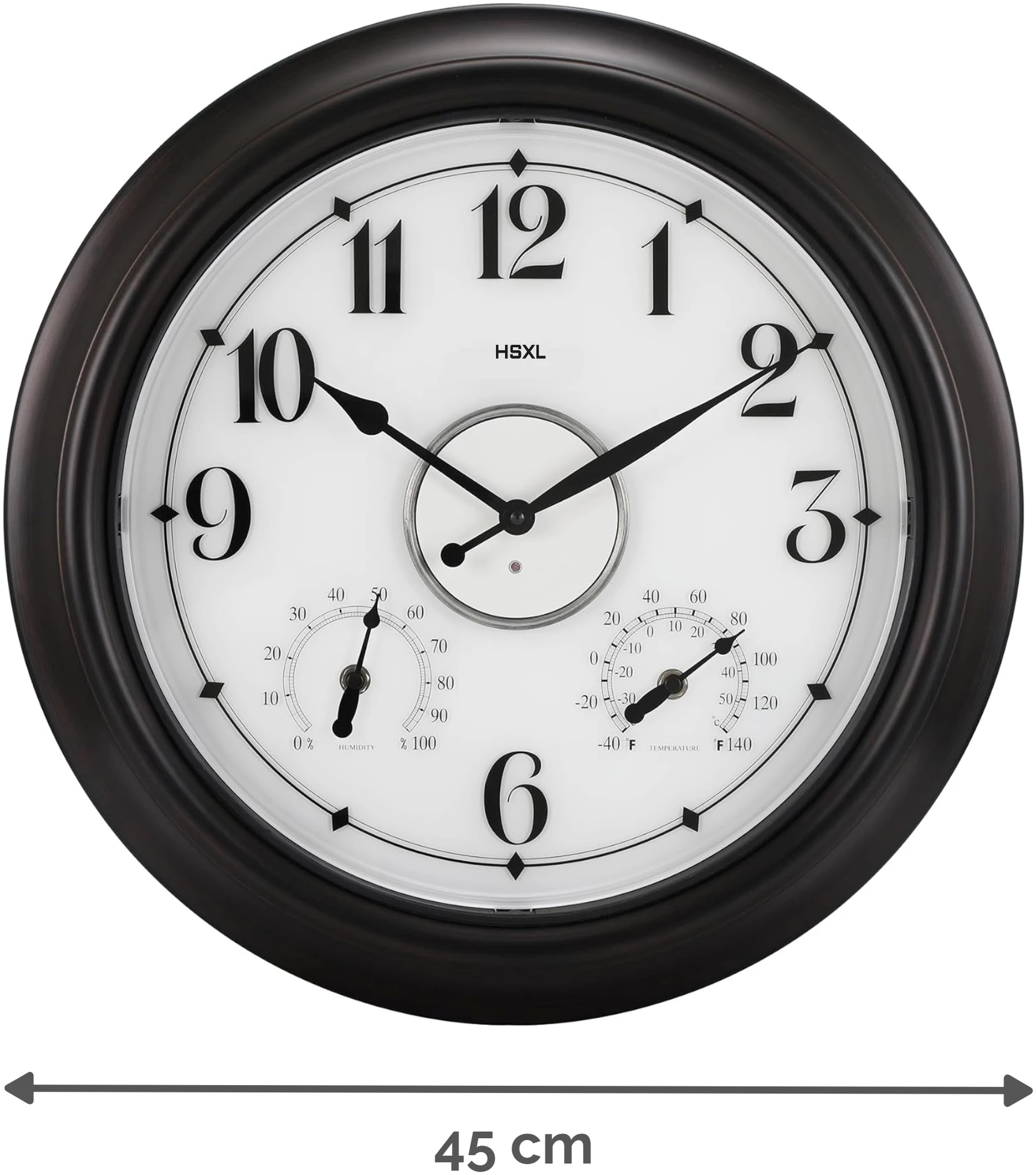 Met een diameter van 45 cm en een waterdichte IP65-behuizing is deze wandklok perfect geschikt voor zowel binnen als buiten. Hang hem in de woonkamer, keuken, tuin, op het terras of onder een overkapping – de klok blijft onder alle omstandigheden goed functioneren.