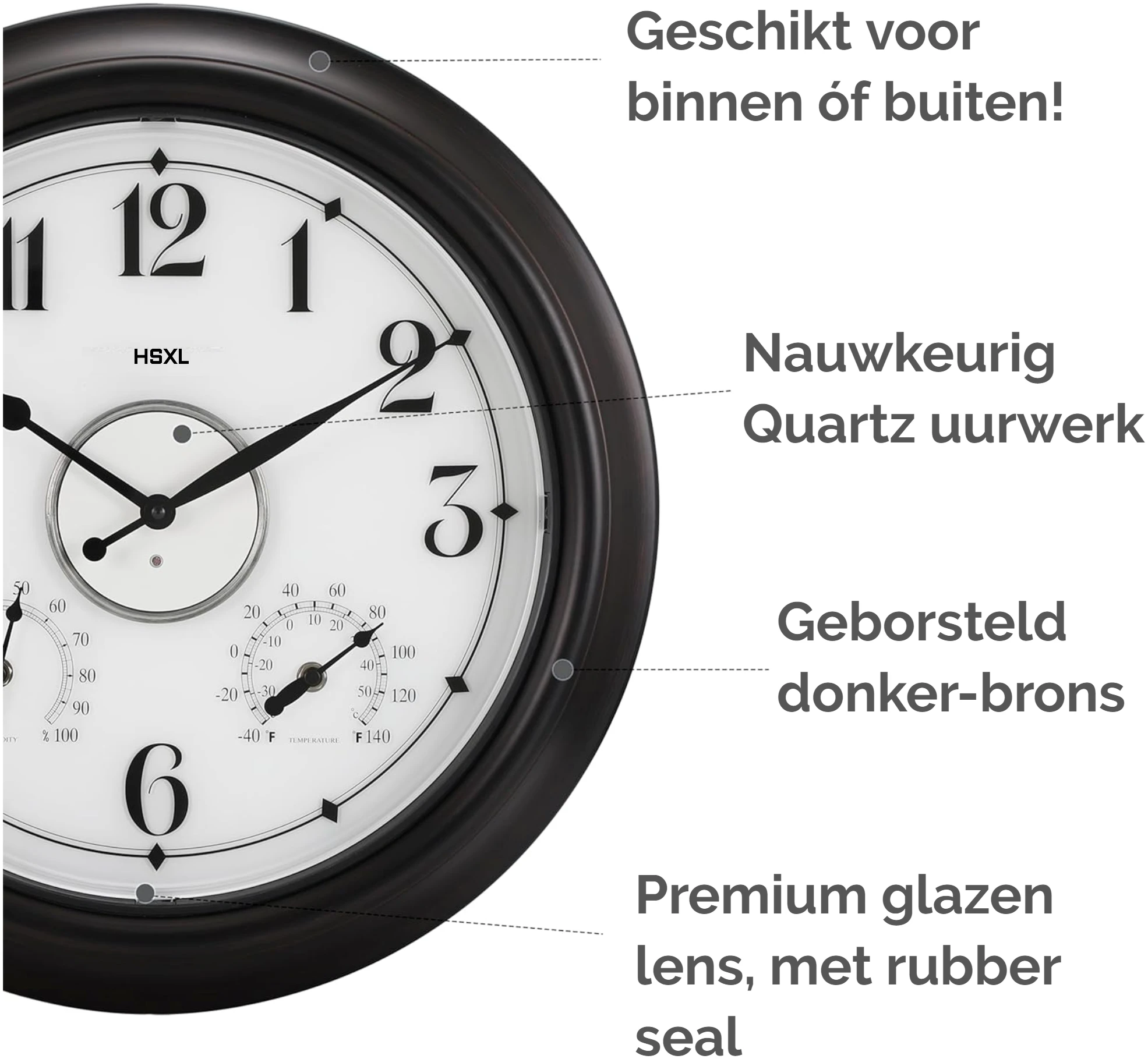 De klok is volledig beschermd tegen regen, vocht en stof dankzij een duurzame afdichting met rubberen pakkingen aan de voor- en achterkant. Daarnaast is de klok UV- en hittebestendig, waardoor hij ideaal is voor langdurig buitengebruik.